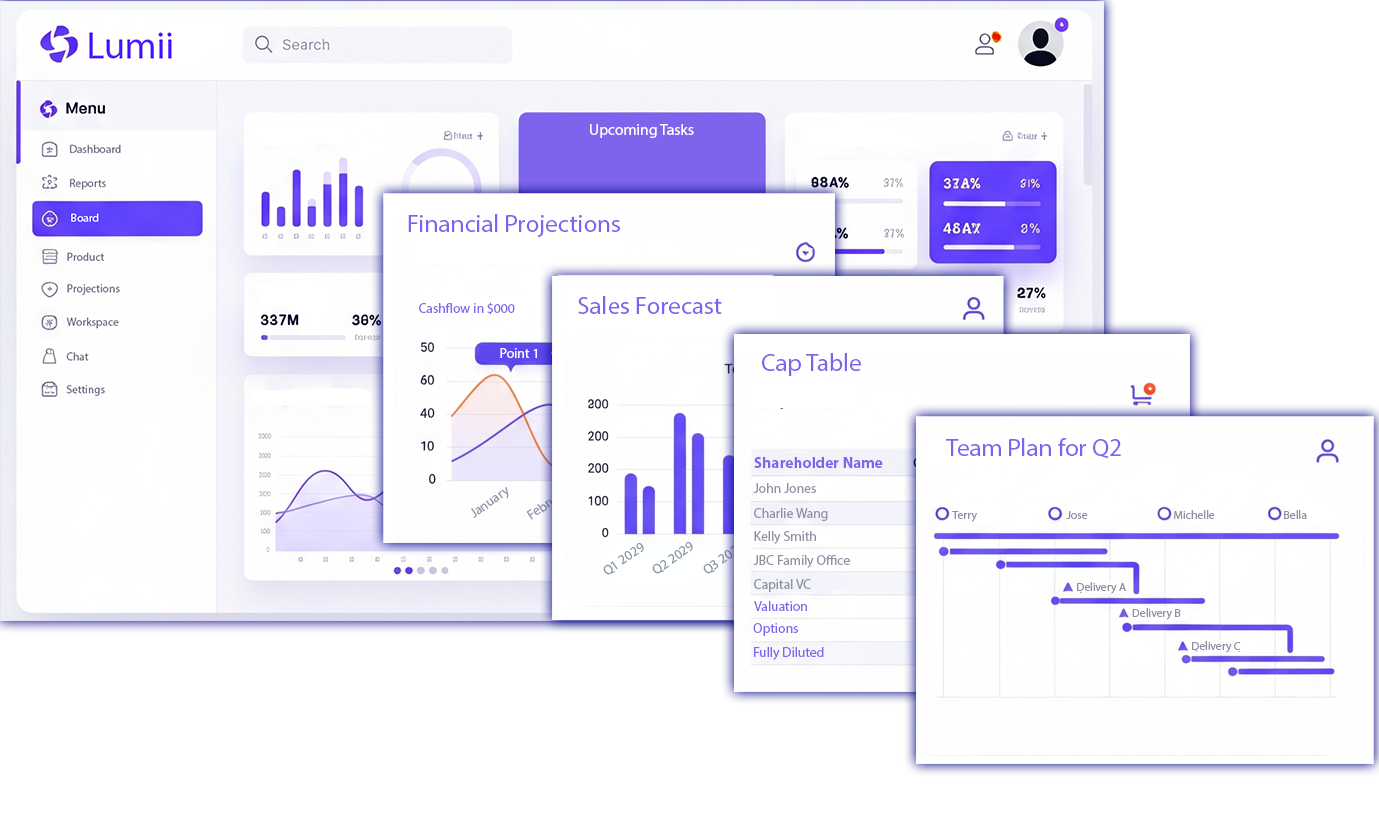By combining the real-world experience of startup and scale-up teams with the efficiency of AI, Lumii by Wstreet Labs provides a single, unified view of your business while eliminating time-consuming manual tasks.Financial & Operational DashboardsAutomatically track and forecast key metrics without manual data entry.Effortless Board & Investor ReportsGenerate professional, up-to-date reports with a single click, ensuring your stakeholders are always aligned.Unified Team PlanningConnect your strategic objectives directly to your team's day-to-day tasks, ensuring everyone is working toward the same goals.